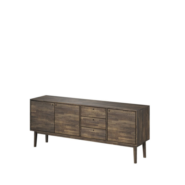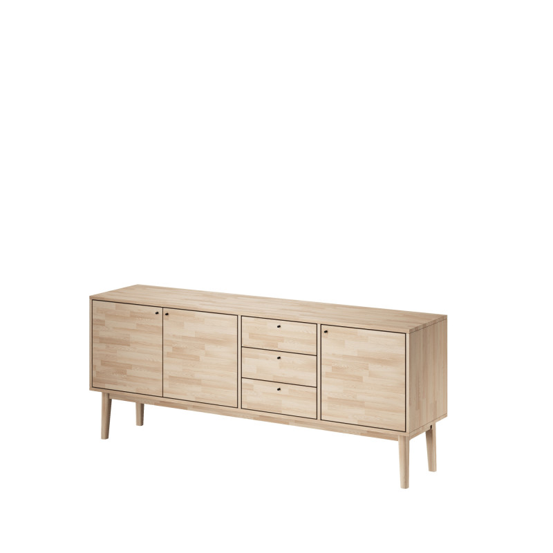 Elegance-skjenken er et stort oppbevaringsmøbel som skiller seg ut med sitt praktiske design. Skjenken er laget av limt heltre eik med to finerte trehyller. Det limte treverket gir et vakrere og større spill i overflaten, ettersom det er mindre fargeforskjeller mellom lamellene. Velg mellom metall- eller messinghåndtak for å endre uttrykket. Dette gjør hvert møbel til sitt eget og bringer mer natur inn i interiøret og hjemmet.