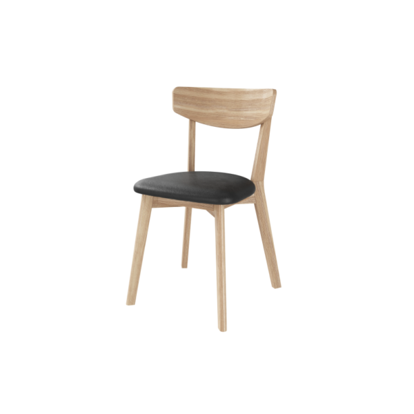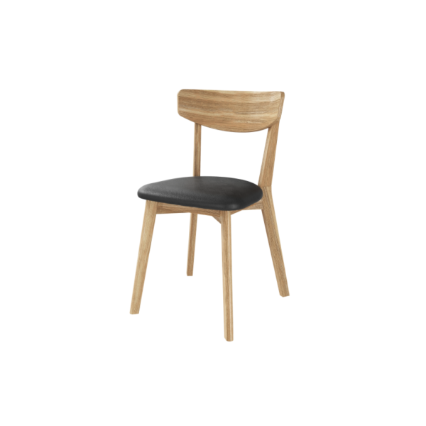 Ryggstøtten er lett buet for å gi komfortabel ryggstøtte og har en avrundet form som følger stolens lette, organiske linjer. Setet er polstret og trukket i svart skinn, noe som skaper en visuell kontrast til treets naturlige tone og tilfører et subtilt preg av eleganse.