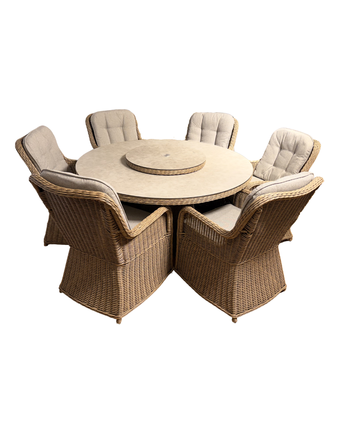 Lekker spisegrupee av høy kvalitet. Komfortable puter i meget vannavvisende stoff. Bord på Ø150cm med dreieplate og integrert isbøtte. Plate i ceramic som er enkel å vedlikeholde.
