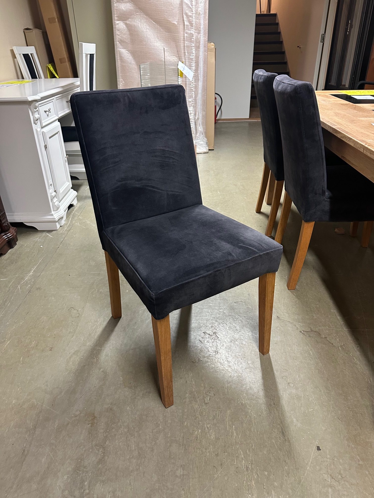 3 stk spisestol James i velourstoff og naturbein. Utstillingsmodell – selges kun samlet.