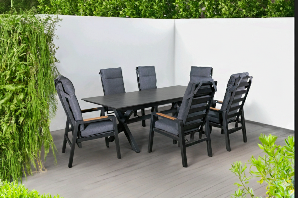 Stilig spisegruppe i aluminium og teak. Regulerbar rygg. Tykke puter.