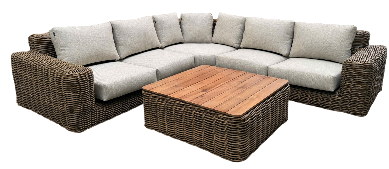 Meget eksklusiv lounge-gruppe i tykk, håndflettet rotting med kraftige, komfortable puter. Bordplate av flott acacia-tre.