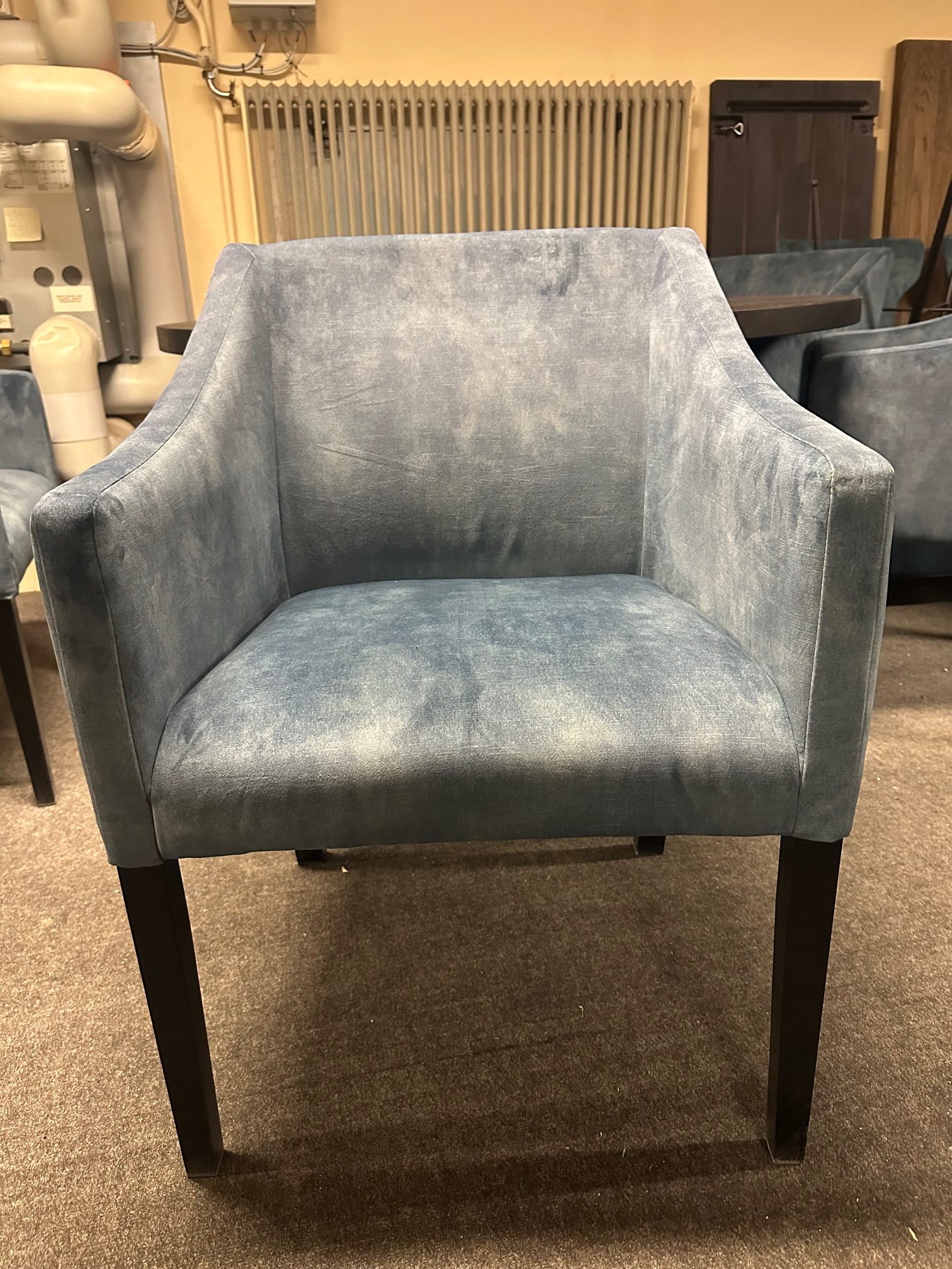 4 stk spisestol med armlener i velourstoff (Adore Petrol). Utstillingsmodell – selges kun samlet.