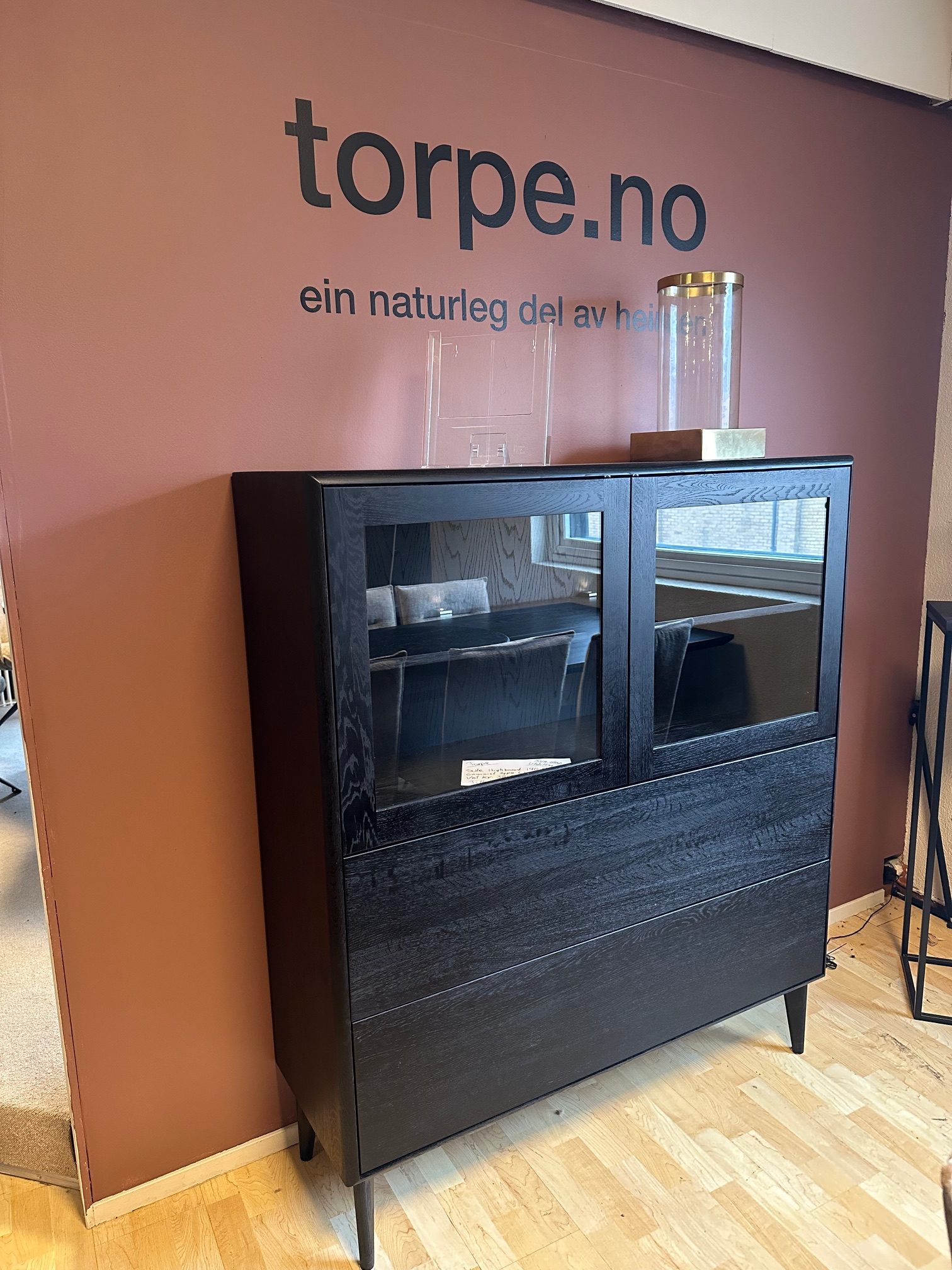Sule highboard 140×120 (1.edition med brede skuffer) – svartlakkert. Utstillingsmodell – selges som det står.