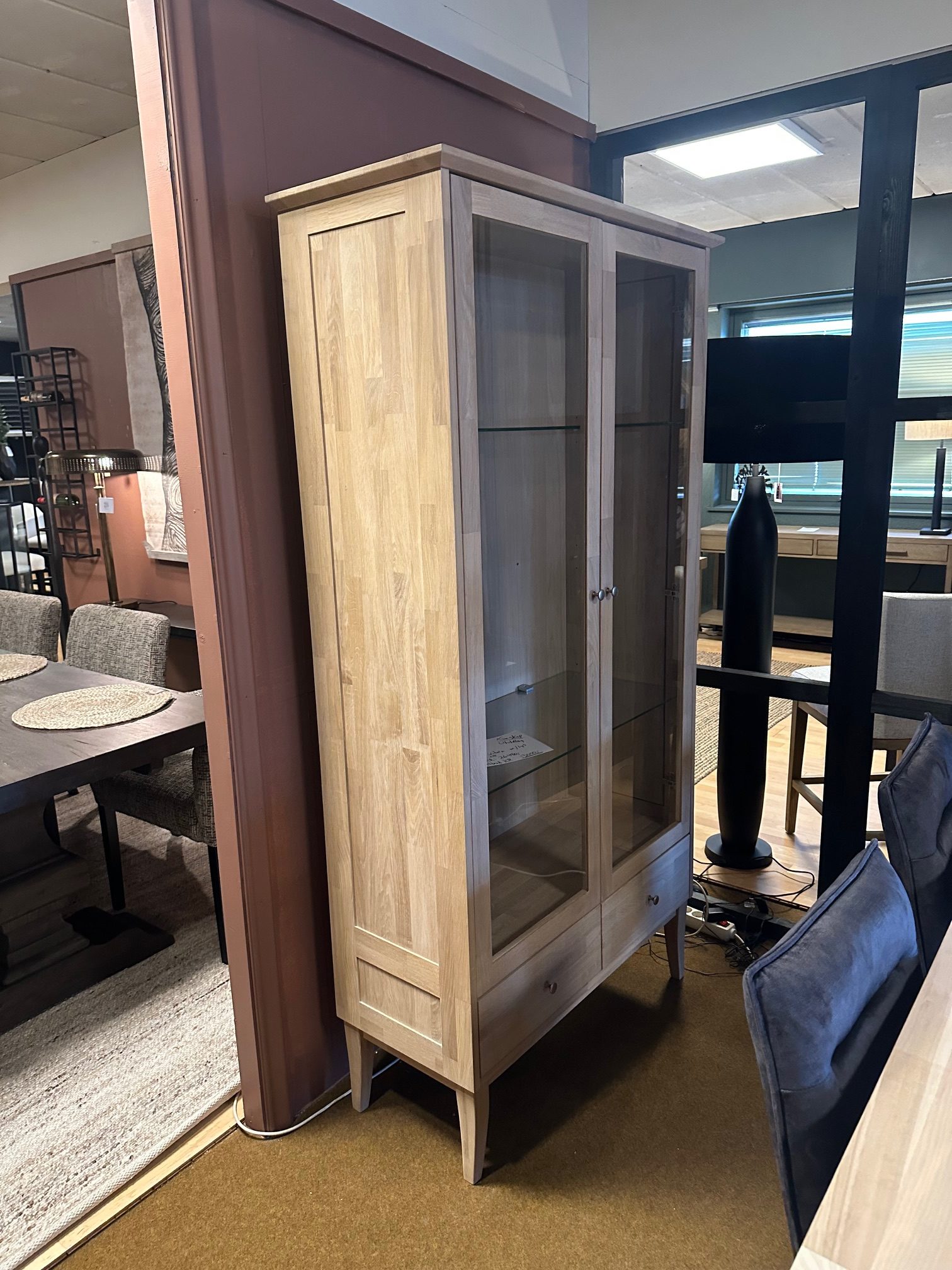 Tucan vitrineskap (101x45x193). Hvitoljet med glasshyller og lys. Ustillingsmodell – selges som det står (enkel justering må påregnes)