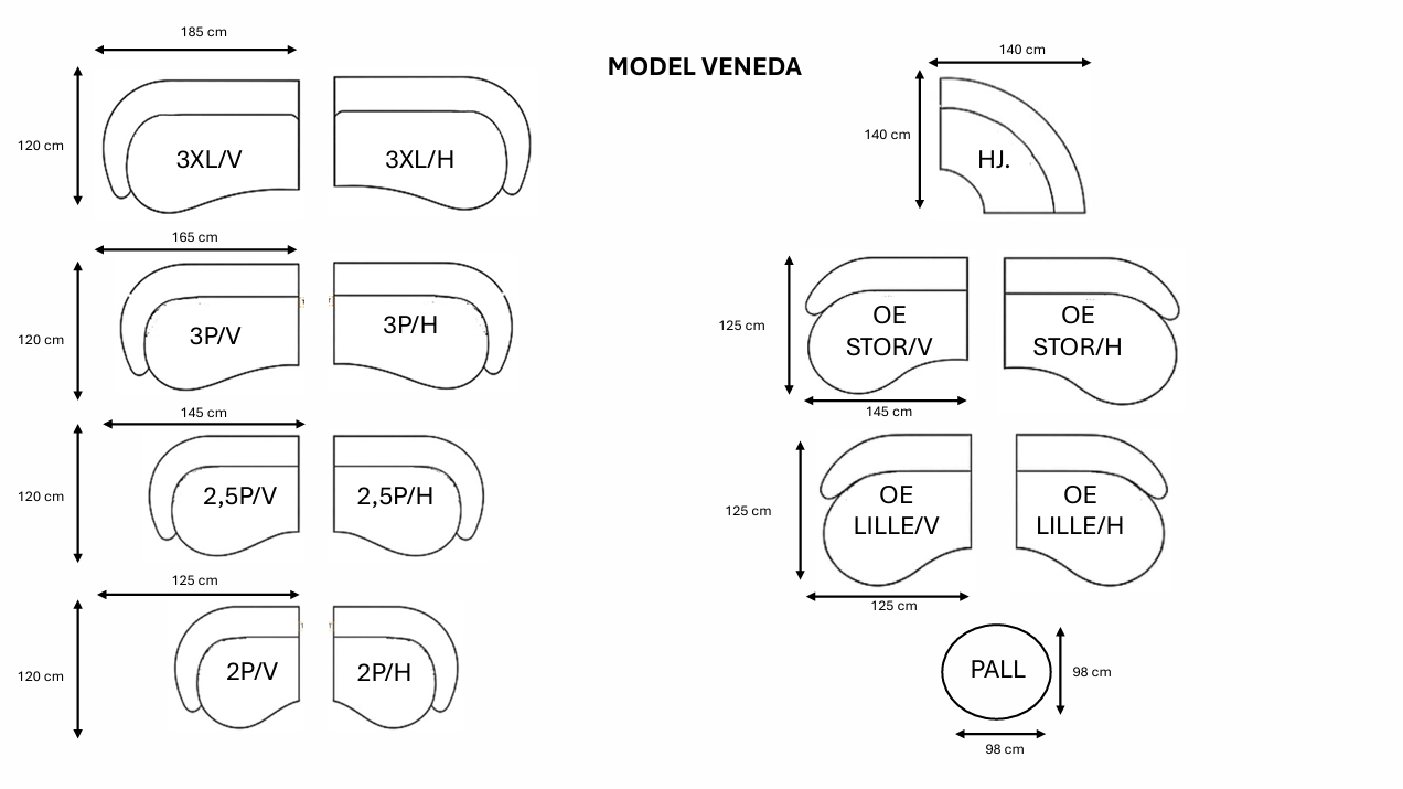 Veneda er en eksklusiv modulsofa som kan bygges etter ønske. Med sine rene linjer og elipseformede moduler, er dette en sofa som blir et blikkfang i enhver stue. Sofaen er helpolstret med skum av høy kvalitet. Veneda leveres Bl.a. som 3-seter, samt i mange stoff og farger.